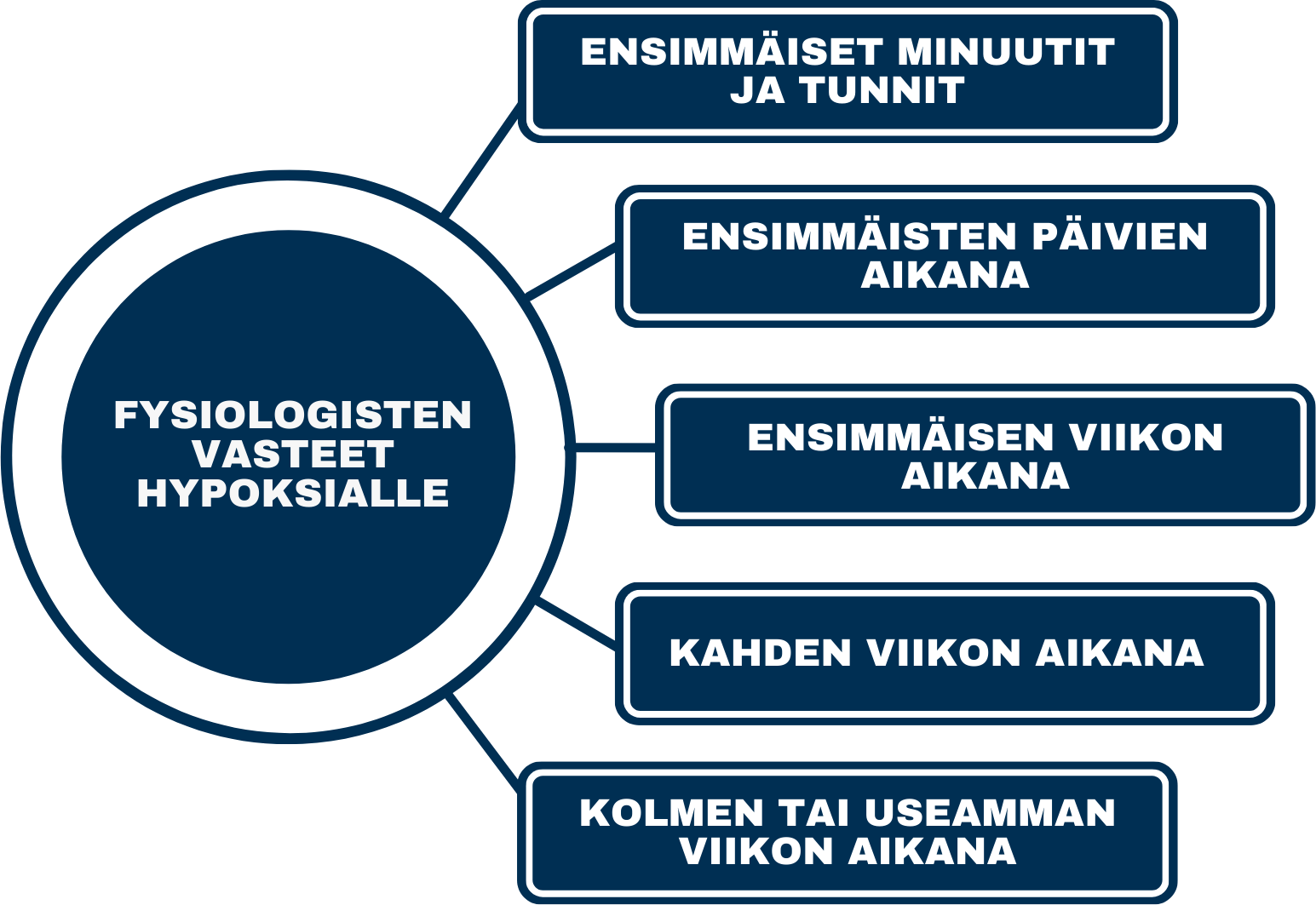 Alhainen ilman hapen osapaine, hypoksia, aiheuttaa akuutteja ja kroonisia fysiologisia vasteita, joilla pyritään parantamaan hapen saatavuutta kehossa. Ensimmäisten minuuttien aikana hypoksiassa veren happisaturaatio (SaO2) laskee laskun ollen sitä suurempaa, mitä korkeammalle mennään. Happisaturaation lasku aiheuttaa ventilaation ja syketaajuuden kiihtymisen, millä pyritään varmistamaan kudosten riittävä hapensaanti, joskin näiden vasteiden suuruusluokka on erittäin yksilöllinen.6 Liikunnan aikainen laktaattipitoisuus nousee ja koettu rasittavuus kasvaa hypoksiassa, jos liikunnan absoluuttinen teho pysyy vakiona, mikä on hyvä huomioida harjoituksia suunnitellessa ja seuratessa. Suuren yksilökohtaisen vaihtelun vuoksi testaus ja monitorointi ovat tärkeitä työkaluja, kun halutaan selvittää hypoksian aiheuttamat yksilölliset vasteet urheilijalla ja optimoida hypoksian aikaista harjoittelua ja kisaan valmistautumista.8