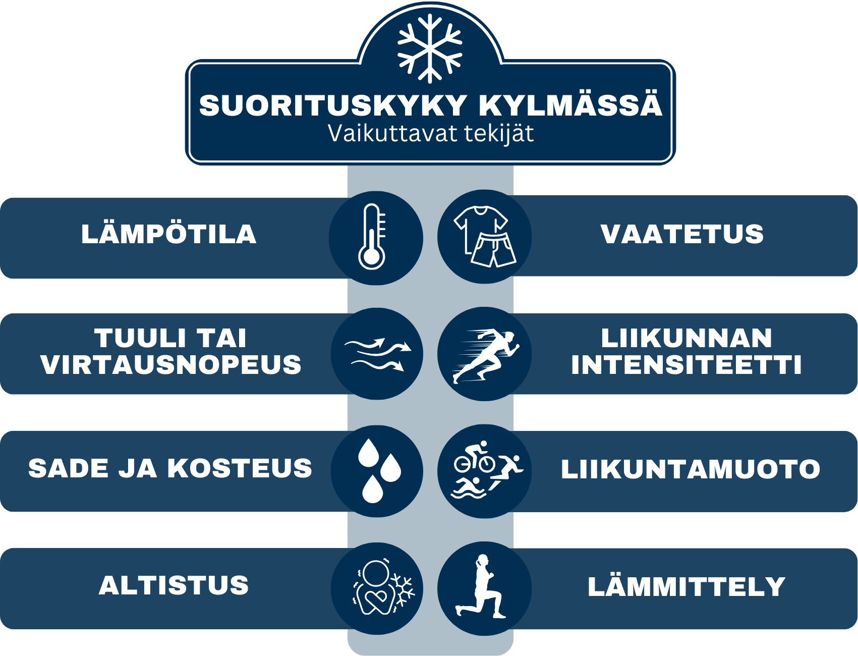 Kilpaileminen, harjoittelu ja toimiminen kylmissä olosuhteissa haastaa ihmiskehoa, ja erityisesti kylmälle altistuvien urheilijoiden, valmentajien ja sotilaiden tulee olla tietoisia kylmyyden aiheuttamista haasteista. Kehon viileneminen aktivoi lämpöä tuottavia ja lämmönpoistoa vähentäviä mekanismeja, jotka auttavat ylläpitämään kehon ydinlämpötilaa. Tämän lisäksi kylmyyden vaikutukset voidaan havaita laaja-alaisesti myös fyysisessä suorituskyvyssä: sekä kestävyyssuorituskyky että voima- ja nopeusominaisuudet heikkenevät kehon kylmetessä. Ymmärtämällä kylmyyden aiheuttamat fysiologiset vasteet ja niiden merkityksen fyysiselle suorituskyvylle voidaan tukea suorituskykyä kylmässä sekä minimoida kylmyyden haittavaikutukset.
