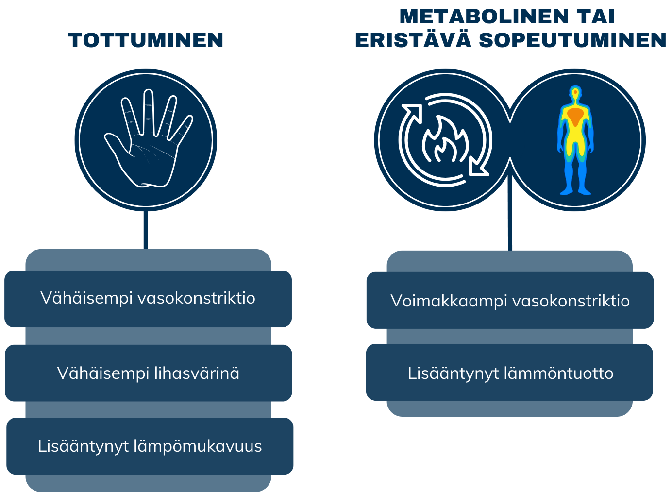 Kylmään sopeutumisen vasteet eivät ole kaikilta osin täysin selviä, mutta tutkimuskirjallisuudessa on esitetty kolmea erillistä sopeutumisvastetta: tottuminen, metabolinen sopeutuminen ja eristävä sopeutuminen. Tottuminen on yleisin sopeutumisvaste pitkäkestoiselle tai toistuvalla kylmäaltistukselle. Tottumisen myötä voidaan havaita lihasvärinän ja ääreisverenkierron supistumisen vähenemistä, mitkä osaltaan vähentävät lämmöntuottoa ja lisäävät lämmön menettämistä ympäristöön. Näiden epäjohdonmukaisilta kuulostavien sopeutumisvasteiden myötä, ihmisen lämpömukavuus kuitenkin lisääntyy, kun raajojen lisääntynyt verenkierto pitää yllä niiden lämpötilaa ja epämukavalta tuntuvat lihasvärinät vähenevät. Metabolisen sopeutumisen myötä ihmisen lämmöntuotto lisääntyy suuremman aineenvaihdunnan aktiivisuuden vuoksi, ja eristävän sopeutumisen myötä ääreisverenkierron supistumisvaste voimistuu, mikä vähentää lämmön menettämistä. On epäselvää, mitkä tekijät vaikuttavat erilaisten sopeutumisvasteiden syntyyn, mutta on esitetty, että esimerkiksi ydinlämpötilan muutos altistuksen aikana voi vaikuttaa siihen, millaisia sopeutumisvasteita muodostuu.1 Kylmäsopeutumisen vaikutusta suorituskykyyn kylmässä ei ole juuri tutkittu eikä tällä hetkellä ole tiedossa, että minkäänlainen kylmäsopeutuminen parantaisi suorituskykyä kylmässä.